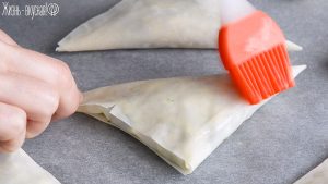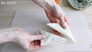 Треугольнички из невесомого теста фило я решила приготовить в двух вариантах – вегетарианский лакто-вариант с творогом и постный, веганский вариант с сыром тофу. Это очень сочно и питательно.