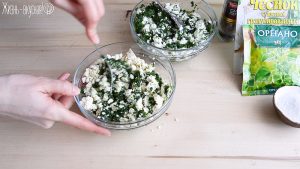 • Приправьте начинку солью, перцем, орегано и чесноком (разделите поровну специи из списка). Также добавьте в начинку лимонный сок. Перемешайте.
