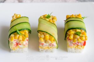 Исключение — крабосалат с рисом и кукурузой: я немного переиграла подачу, и салат заиграл по-новому! Мне очень нравится то, каким он получился.