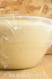 - Смешали дрожжи, молоко и часть муки, накрыли, и оставили для брожения, пока опара не увеличится в объеме вдвое.