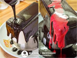 - Замороженный торт покройте глазурью. Я использовала зеркальную глазурь на черном шоколаде + немного на белом шоколаде, окрасив ее в красный и добавив кандурин для блеска. Для украшения я сделала снежинки из белой шоколадной глазури.