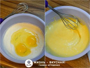 - Смешайте сухие ингредиенты, а затем добавьте яйца и тщательно перемешайте венчиком. Взбивать до пышности ничего не нужно – все быстро и просто!