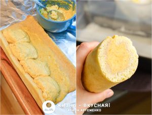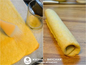 - Аккуратно разверните бисквит, уложите внутрь курд и сверните трубочкой. Эту конструкцию плотно заверните в фольгу или пищевую пленку и отправьте в морозилку.