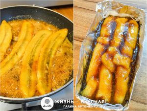 - После того, как бананы выложены ровным слоем, вылейте пряную карамель и остудите все это сооружение, а затем заверните фольгу, при необходимости заверните в пищевую пленку и отправьте в морозилку.