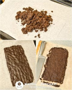 - Это тесто получается невероятно рассыпчатым, и оно очень напоминает знаменитый шортбред. Работать с испеченной основой нужно очень аккуратно, чтобы она не разломалась. Это тесто мегашоколадное, практически несладкое, с ощутимой горчинкой какао – очень глубокий, бархатный, элегантный вкус, который просто прекрасно будет сочетаться со следующим слоем.