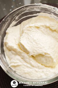 - Отдельно взбейте сливки до пышного, кремового состояния и понемногу вмешайте в остуженный крем.