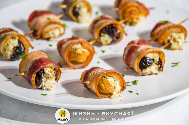 - С размягченных сухофруктов сливаю воду. Чернослив раскрываю. Инжир разрезаю напополам, так как он крупнее по размеру, и тоже раскрываю каждую половинку, чтобы туда было удобно поместить начинку. Сладость сухофруктов тут круто дополнит пикантность грудинки. Отличная закуска на 1 укус.