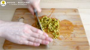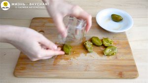 - Готовлю начинку. Для того, чтобы эти маленькие рулетики были бомбочками вкусов, добавляю в начинку еще и оливки. Представьте это сочетание вкусов: копченое, сладкое, кисленькое и соленое! Итак, раздавливаю оливки дном банки и извлекаю косточки. Если возьмете оливки уже без косточек, вы молодец!