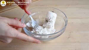 - В небольшую миску отправляю козий сыр. Если не любите или нет доступа, используйте сливочный сыр, но с козьим это будет особый восторг! Добавляю к сыру немного перца и разминаю его.