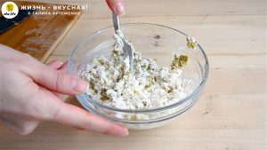 - Добавляю к сыру оливки и перемешиваю смесь. Она получается довольно пластичная и удобная.