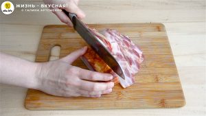 - Теперь тонко режу варено-копченую грудинку. Нужно 24 полоски. Отлично подойдет также бекон, а если вы хотите приготовить холодный вариант такой закуски, берите прошутто или хамон.