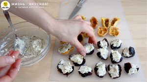 - Теперь наполняю каждый сухофрукт начинкой — получается примерно по половине чайной ложки сырной смеси на порцию.