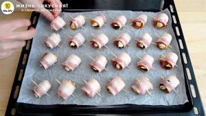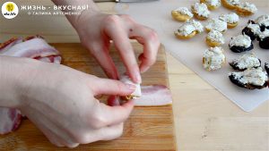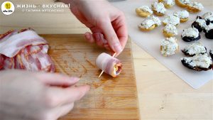 - Каждую порцию оборачиваю грудинкой и фиксирую при помощи зубочистки.