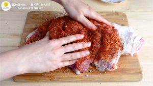 - Приправляю пласт. Щедро солю, посыпаю копченой паприкой, молотым кориандром и сворачиваю рульку.