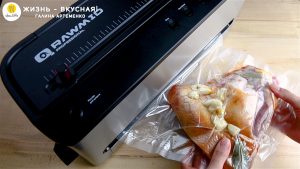 - Отправляю рульку в пакет. Туда же — весь чеснок и лавровые листья. Вакуумирую мясо.