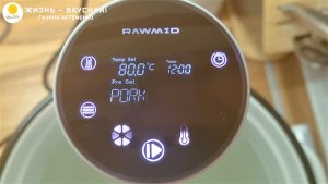 - Устанавливаю сувид в кастрюлю с водой и выбираю режим приготовления “Pork” (свинина). Время — 12 часов. Когда вода дошла до нужной температуры, я отправила туда рульку. Удобно оставлять для приготовления на ночь. Я именно так и сделала!