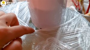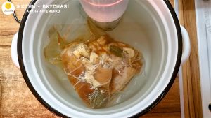- Чтобы вода не испарилась за время длительного приготовления при довольно высокой температуре, я обмотала верх кастрюли пленкой, оставив небольшие открытые части. Их достаточно, чтобы не герметизировать слишком плотно, и при этом вода не будет испаряться слишком сильно и быстро.