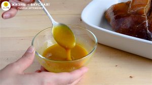 - Делаю глазурь. Она очень простая! Смешиваю нежную по вкусу горчицу, мед, немного соли, и добавляю немного сока от приготовления.