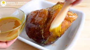 - Обмазываю рульку и отправляю ее в духовку. Режим “Конвекция”, температура — 180°. Готовлю 45 минут, каждые 15 минут обновляя слой глазури.