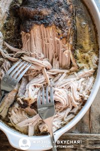- По истечении 12 часов снимите фольгу и разберите мясо на волокна, изъяв кости. Разобранное мясо получится погруженным в соки. Оставьте так до полного остывания.