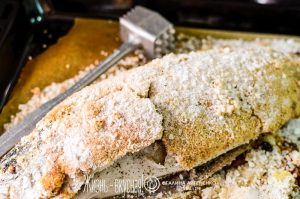 - Когда рыба будет готова, достаем противень с ней из духовки и даем постоять 10 минут, после чего вооружаемся молоточком и раскалываем соляную корку.