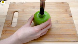 - Удаляю сердцевину яблока. У меня яблоко сорта Гренни Смит — это должен быть кисло-сладкий сорт, чтобы вкус салата был сбалансированным и объемным. Можно срезать кожицу, но я ее оставляю — у этого сорта она не слишком жесткая, так что вкусу не помешает нисколечко.