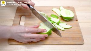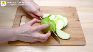 - Нарезаю яблоко пластинами толщиной около 2-3 мм, а затем режу соломкой.