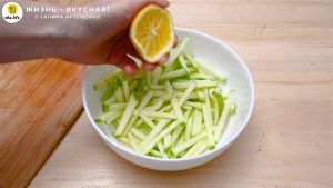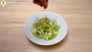 - Сельдерей отправляю к яблокам. Перемешиваю.