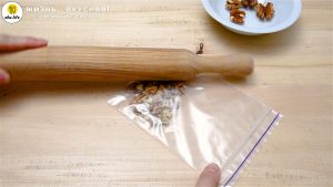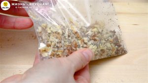 - Теперь займусь орехами. Откладываю несколько целых половинок для красивой подачи, остальные орехи я отправляю в пакетик и разбиваю скалкой в крошку. Можно также орехи порубить, но мне удобнее их именно разбить.