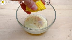 - Готовлю соус для заправки: смешиваю майонез с солью и столовой ложкой лимонного сока. У меня майонез домашний, рецепты собраны в этом посте. Соус так станет более жидким и более кислым — так как в яблоках есть сладость, вкус будет сбалансированным.