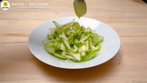 - Режу черешковый сельдерей диагональными полосками. Можно нарезать его соломкой, но мне такая форма нравится больше.