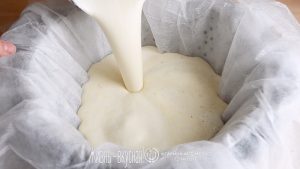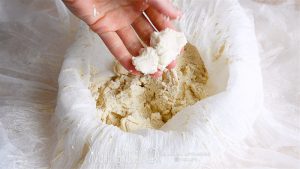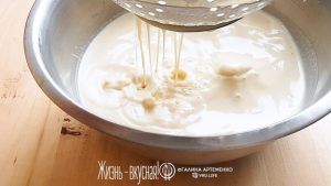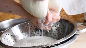 • Получившуюся массу нужно отфильтровать. Я использую 2 слоя тонкого агроволокна. Можно использовать несколько слоев марли или специальные мешочки для фильтрования сыра.