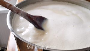 • Молоко доведите до кипения и кипятите в течение 10 минут. Не отходите от него далеко — оно будет активно пениться, и может убежать. Зачем вам нужна лишняя мойка плиты?))