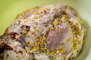 - Добавьте горчицу, и этой пряной смесью натрите ногу. Так как времени у меня было немного, я оставила мариноваться мясо при комнатной температуре — 2-3 часа. В холодильнике можно на ночь. Так будет удобнее.
