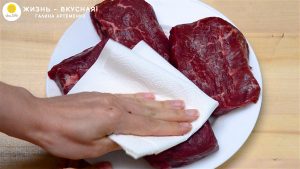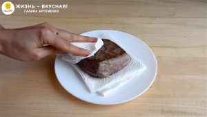 • Достав мясо из вакуумной упаковки, в которой оно продавалось, промакиваю его бумажными полотенцами, чтобы убрать лишнюю влагу.