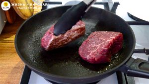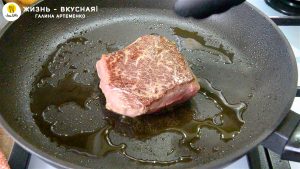 • Теперь я быстро обжарю стейки — так я получаю вкус обжаренного мяса еще до приготовления и убиваю возможные бактерии на поверхности. Итак, очень сильно разогреваю сковороду на сильном огне. Проверяю разогрев, капнув капельку воды. Если танцует — можно обжаривать.