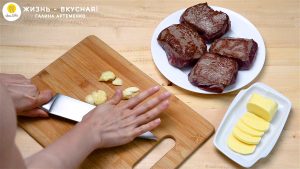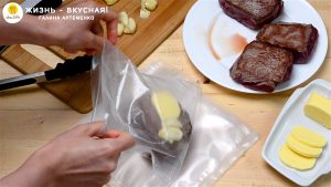 • Отправляю стейки в пакеты, туда же — чеснок и сливочное масло.