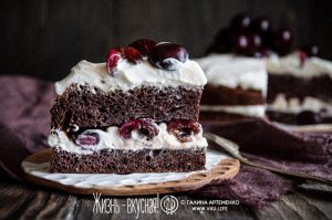 - Соберите торт: на нижний корж выложите половину крема и распределите половину черешни. Накройте вторым коржом. Его смажьте оставшейся половиной крема, а черешню выложите по центру торта горочкой. Отправьте в холодильник для пропитки.Я дополнительно (ради фото, ессесна) добавила несколько свежих черешенок на верхушку.