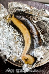- 1 банан запечь в кожуре, завернув в фольгу