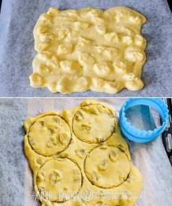 - Готовый бисквит остудите и при помощи круглой формочки для печенья вырежьте 4 окружности – это будут донышки для тортов.