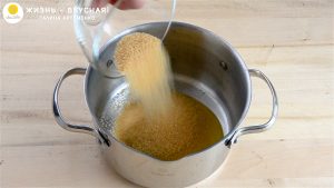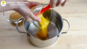 - Первым делом готовлю тесто. Отправляю в кастрюльку мед и сахар.