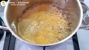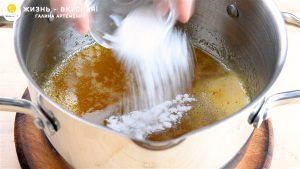 - Снимаю медовую смесь с огня и всыпаю соду. Хорошенько перемешиваю смесь. Она начинает сильно пениться и становиться темнее — как раз эта операция и сделает вкус основы насыщенее, интенсивнее. И это придаст тот самый узнаваемый вкус торту!