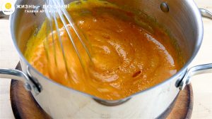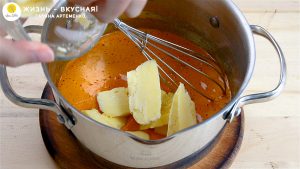 - Когда пена перестанет образовываться так активно, добавляю в основу сливочное масло. Под действием температуры оно растает. Перемешиваю смесь до однородности.