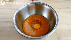 - Теперь переливаю медовую смесь в миску. Вбиваю в смесь яйца и перемешиваю до однородности венчиком.