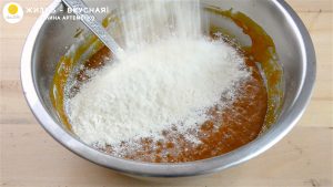 - Теперь всыпаю муку. Делаю это в 2-3 приема, потому что тесто может брать плюс-минус разное количество. Тут стоит ориентироваться больше на его вид и консистенцию.