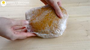 - Заворачиваю тесто в пленку и оставляю минут на 30-40 полежать, распластав его. Лучше убрать в холодильник.