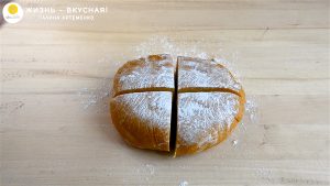 - Займусь коржами. Делю тесто на 4 порции.