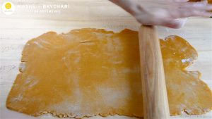 - Пласт толщиной около 2 мм, достаточно тонко. Размер коржа должен быть таким, чтобы можно было вырезать из него сразу 2 коржа.