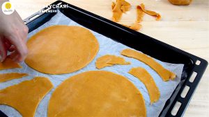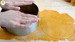 - Вырезаю коржи при помощи кольца на 18 см.Остатки не перезамешиваю — они сразу же идут на выпечку вместе с коржами, для отделки.