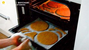 - В моей духовке есть режим конвекции, так что я выпекаю 2 противня за раз, т.е. по 4 коржа. Температура выпечки — 200°, время — 6 минут.